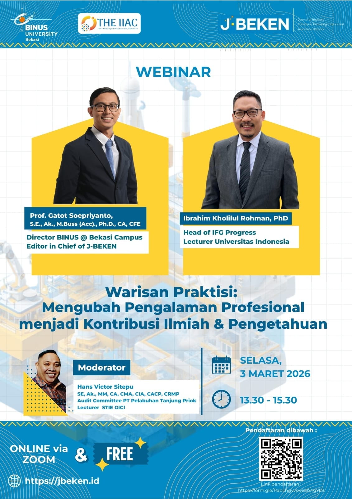 Banyak praktisi memiliki insight strategis dan best practice yang sangat bernilai, namun belum terdokumentasi secara ilmiah. Padahal, pengalaman tersebut dapat menjadi warisan intelektual yang memberi dampak melampaui masa jabatan dan organisasi. Webinar ini membahas bagaimana mengubah praktik profesional menjadi karya ilmiah yang terstruktur, publishable, dan membangun legacy keilmuan.